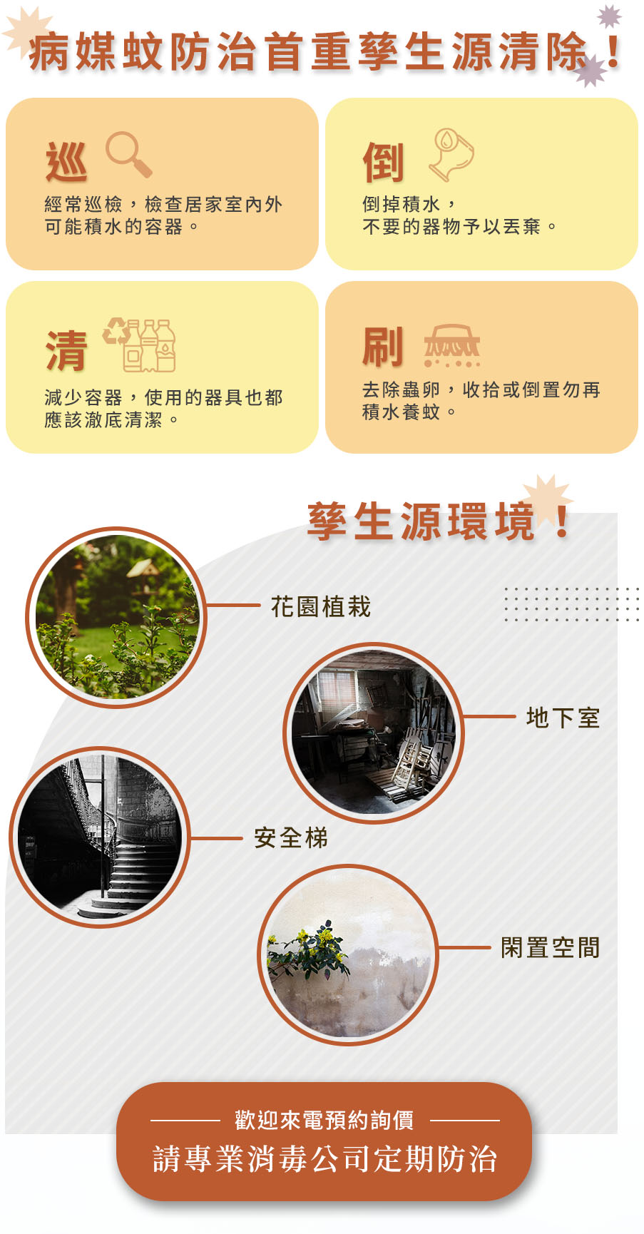 - 如有無可避免之孳生源環境,如公園、水溝、污水池、水池等,建議請專業消毒公司定期防治。