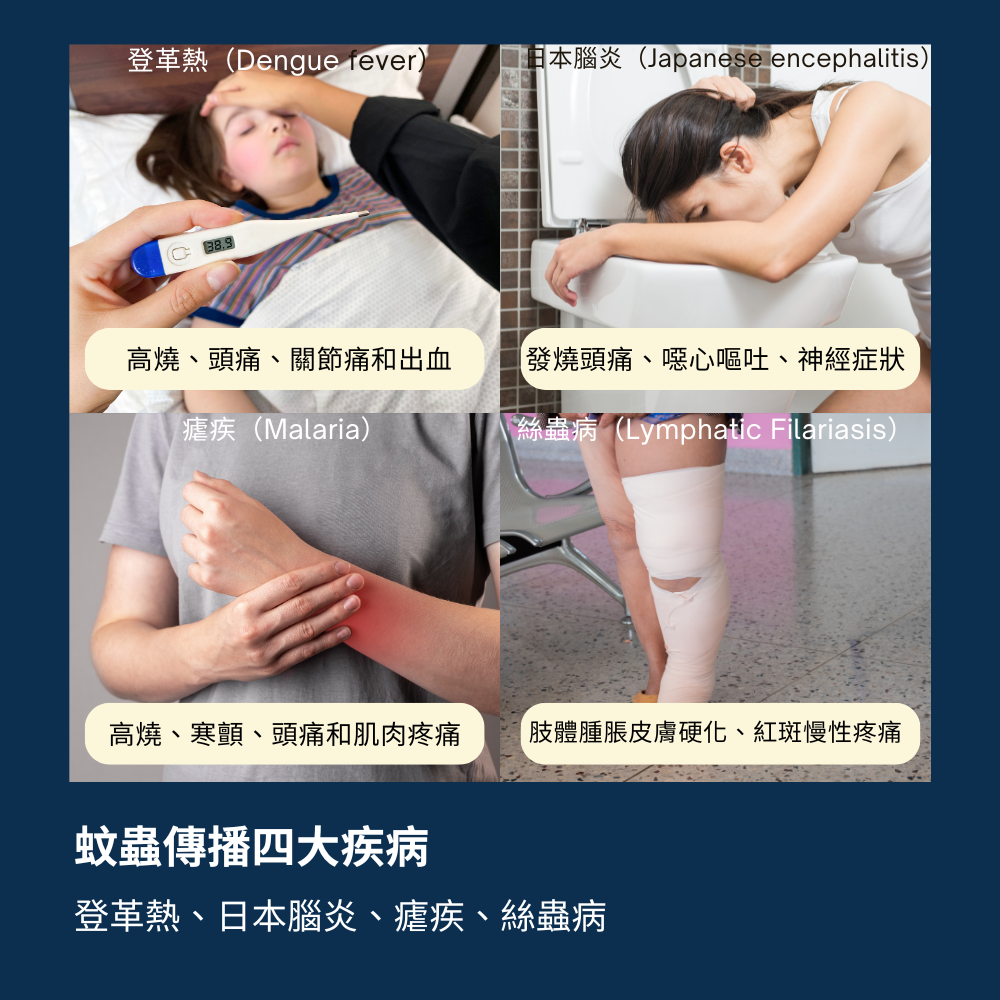 - 日本腦炎(Japanese Encephalitis):日本腦炎是由環蚊傳播的病毒性疾病,症狀包括發燒、頭痛、噁心、嘔吐和神經症狀等。此病病死率高達30%,特別是在嬰幼兒和老年人群體中更易受感染。